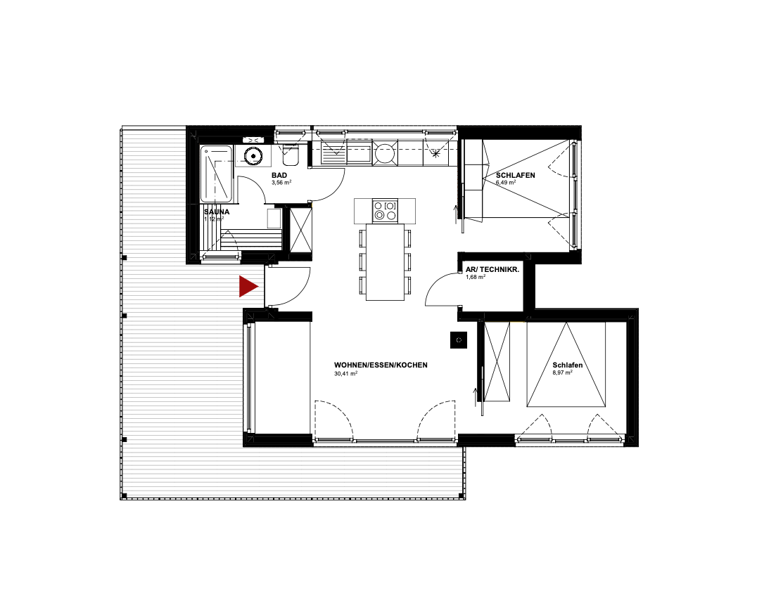 - Ausstattungen: Bad mit Regendusche (inkl. Föhn & Handtuchtrocker), Filterkaffeemaschine, Großes Panoramafenster, Terrasse, TV und WLAN, voll ausgestattete Wohnküche
